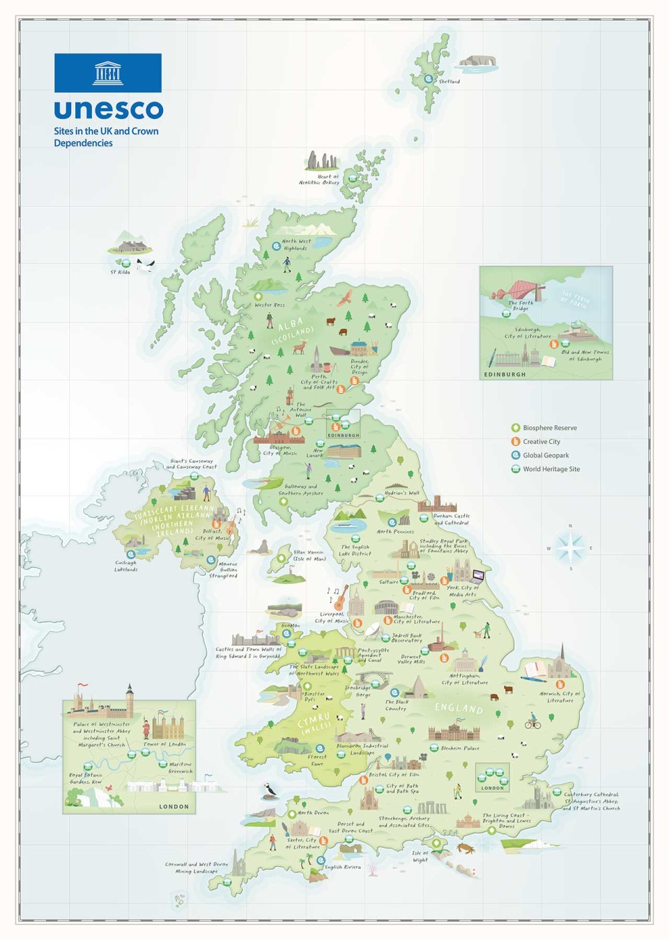 From expansive mountain ranges and stunning coastlines to vibrant cities and rural landscapes - the UK’s UNESCO sites are destinations of world-class natural and cultural heritage. For the first time a map, designed by the creative cartographer Tom Woolley, brings together all of the Biosphere Reserves, Creative Cities, Global Geoparks and World Heritage Sites across the British Isles that are waiting to be discovered.